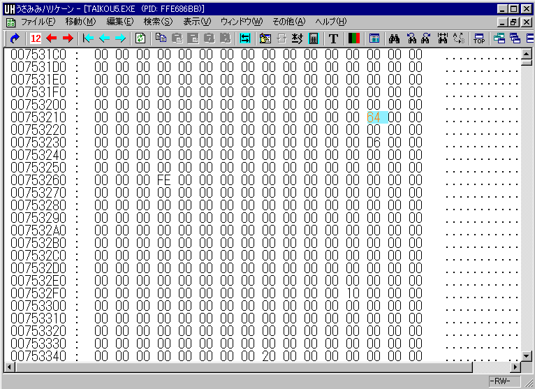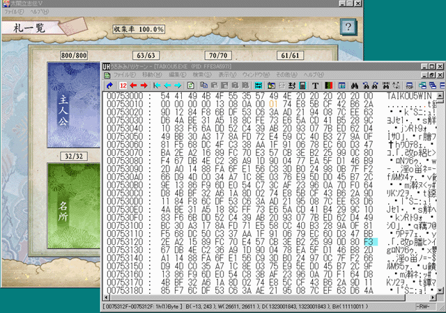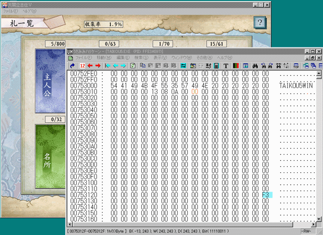 『おまけモードの武将カード800人分ALL化をプロセスメモリエディタとデバッガで簡単に達成してみる』 [使用ツールollydbg/うさみみハリケーン] 私自身がそうだったのですが、およそプログラミングの基礎知識等の無いままにとにかく改造・解析を始めてみようと考えると、最初に触れるのが 所持金パラメータ等のワークコードかCGモード等によく用いられるフラグコードのサーチ、及び構成かと思います。後者の場合、多くの方が空の環境フラグデータ等を用いプロセスメモリエディタのメモリサーチャ 機能による見当・変動サーチ等にて絞りこみを行い、最終候補よりフラグの構成を判別。予測乃至メモリ上他ファイルから必要データを調べ、補完するケースが比較的多めだと思います。 実際、私もそのような解決方法を辿る場合が少なからずありますが、このような手法は簡易にとりかかれる反面、頻繁にアドレス変動して しまうものにはとても効率が悪く、予測され得るフラグ構成が暗号化を始めとする判別阻害要素を含んでいた場合、その時点で解析作業が一時中断してしまう可能性があるかと思います。 前記の手法は基本的なものですが、その時点における視点を少し変えることで効率良く大きな結果を出せる場合があります。 ここで上記の手法に存在する概念を抽出し、整理してみると大体次のようになることがわかります。 ◇サーチ候補から得られたフラグ値の実態は、あくまで個々の解析者の経験上に基づく予想の域を越えない ◇件のフラグ型コードの本旨は、あくまで解析者の「補完」によって構成される 「視点を変える」と先に述べたので、それに併せて各々を反転し、次の概念に基づく手法を模索することにしてみます。 ◇デバッガによる解析からフラグ値の実態を判断し、仕様に沿った完全に正しいフラグ値を得る ◇件のフラグ型コードの実態をプログラムルーチンから抽出する 以上を踏まえて、題材である太閤立志伝5ver1.31につき、対象ソフトのフラグコード中最も難解であろう武将カード800人分ALL化について考察してみます。 これは結果としてアドレスは変動しないものの、フラグ成立時の値が特殊な法則に沿った値になる上(復号できないため暗号化とは微妙に異なる)、1人1バイトとして計800バイトサイズ のコードになるものです。ちなみに他カード種類に関しては、対象アドレス中の各ビットがフラグになっているに過ぎない基本的なものなので、それらに関する叙述は省略します。また、以後の叙述にあたっては、 デバッガとプロセスメモリエディタの併用を前提としたうえで進めます。 →<初期状態はこのようになります>[画像] デフォルトで選べる主人公候補のところだけフラグが成立しています。一見単純な暗号化っぽく思えますが、 少しゲームを進めていくと対象武将が違うのに、フラグ値が同じ状況が複数出現してきます。 解析の前段階にあたっては、初期のアドレスのあたり(任意の武将カード入手で成立するフラグの存在箇所 )は普通に変動サーチで求めておきました。対象ソフトの開発元であるコーエーは汎用的なパラメータ・フラグデータをモジュールエリア内で構成する傾向があるので、これまでの経験を参考として従うのにも 試す価値があると判断できたためです。実際に検索できたので、次に最初の確認事項として以後の解析にあたっての後慮を取り除きます。 つまりは、アドレスのあたりが正しいか、及び安定しているか(アドレス変動しないか)を確認すること。であり、そのために ◇ヒットした候補を初期値(否成立状態)に書き換え、効果が消えるか(あたりが正しいか)を調べる ◇前記成立後、該当アドレスにフラグ存在状況を発生させるフラグストアコードをデバッガで検出する Module=TAIKOU5.EXE 00506F57 81FE 20030000 CMP ESI,320 //武将IDが最終番以降か、同時に書き込み範囲がオーバーしていないかの判定 00506F87 889E 18307500 MOV BYTE PTR DS:[ESI+753018],BL //IDを基に設定されたアドレスにフラグをストア ESIレジスタ=相対オフセット並びに、800人からなる武将のID番号[0000-031Fh/4byte] BL レジスタ=該当武将カードの存在を示すフラグ値[01h-FEh/1byte]先の後者要件に関し、注目すべきコードは上記の2つ。ここから判断できる状況は、 ◇武将カード1人分につき1byteのフラグと同サイズのストア範囲をもつ ◇IDの最終番号は800。ひいてはフラグエリアは都合800byteサイズになる ◇該当フラグエリアはアドレス753018hをベースとし、アドレス変動を起こさない ◇アドレス506F87hにブレークすると、対象武将のIDと対応するフラグ値が簡単に判明する 最終目標は、全武将IDから対応アドレスを知り、フラグとなる値を調査することですので、アドレス506f87よりblレジスタ への干渉を溯るのも一つの手段になりますが、はっきりと全容を知るために、ここでアドレス506f87のコードの要素を纏めて みます。 A.)該当コードアドレスは、ゲーム内でフラグ成立要因が発生した時点でしか通過せず、一度に一人分のデ